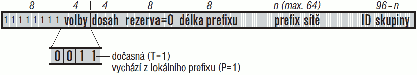 Za prefixem identifikujícím skupinovou adresu následují čtyři bity příznaků: